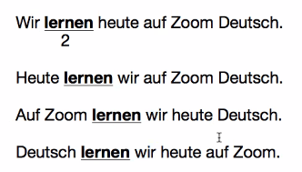 As you can see, the verb “lernen” (learn) remains in the second element of the sentence here. Each expression is grammatical, but may differ in meaning based on the emphasis or stress on a certain element. For example, “Deutsch lernen wir heute auf Zoom” places emphasis that German is the language we are learning on Zoom today, while for “Auf Zoom lernen wir heute Deutsch”, it places emphasis that it is on the platform Zoom that we are learning German on today.