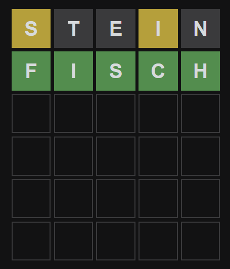 My opening guess at first was a verb called “sagen” (to say). It contains pretty much what one could expect for an initial guess, some of the most commonly used letters in German (maybe except “g”). But over time, I watched this change to the word “stein” (stone), which could help check for the presence or absence of certain consonant clusters or consonant combinations.