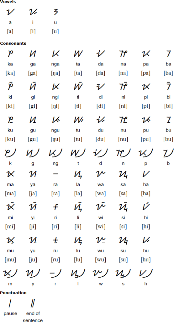 Today, Hanunoo, also known as Mangyan Baybayin or Surat Mangyan, is usually written in the Latin alphabet. But there is a writing system in use since the 14th century, belonging to the Brahmic family of writing systems. It is thought to be closely related to Sulat Tagalog, and derived from the Kawi script of Java, Sumatra, and Bali. Thus, it should come as no surprise that the Hanunoo script is an abugida, that is, a writing system where each character carries an inherent vowel /a/, and diacritics can change the vowel value of the character syllable. Interestingly, syllable-final consonants are not really written, requiring the reader to derive the intended final consonant from context.