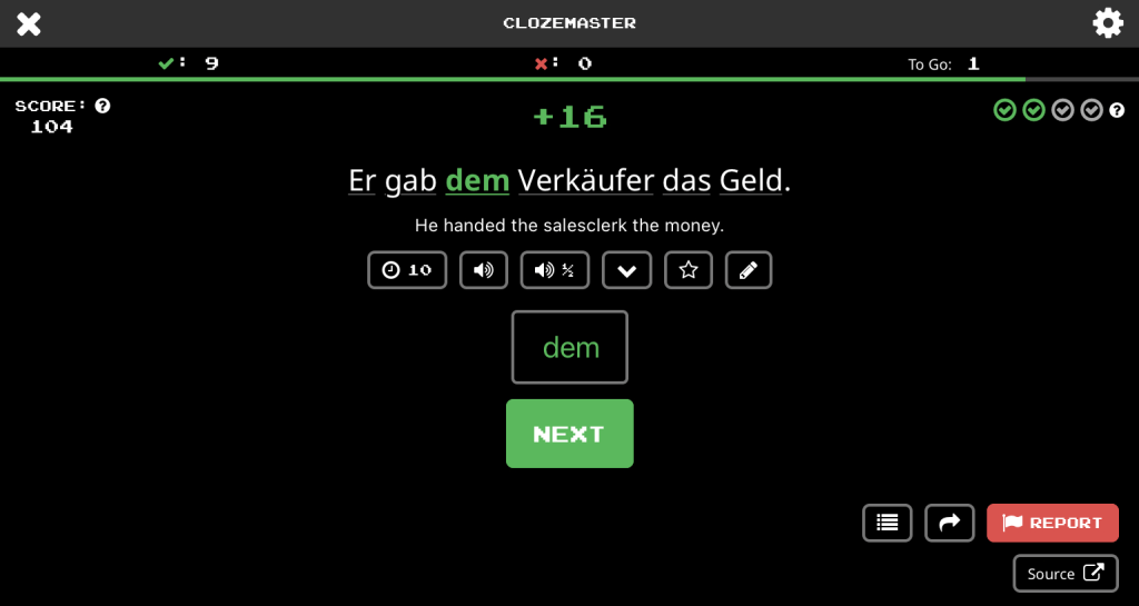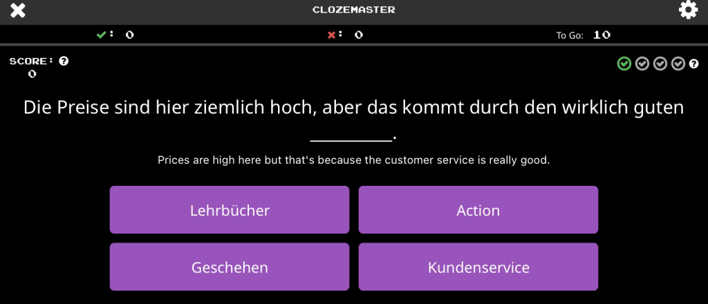 In the second one, the available options are LehrbΓΌcher (textbooks), Action (action), Geschehen (done, occurred, happened), and Kundenservice (customer service). Once again, the words used as options could have been more or less related to Kundenservice, the correct option here. As such, this gave an impression of matching word to sentence, rather than understanding the nuances between very similar words, and their corresponding contexts in which they are used. The improvement in selection of cloze options would make Clozemaster more effective in training vocabulary through this method, and would make a welcome change.