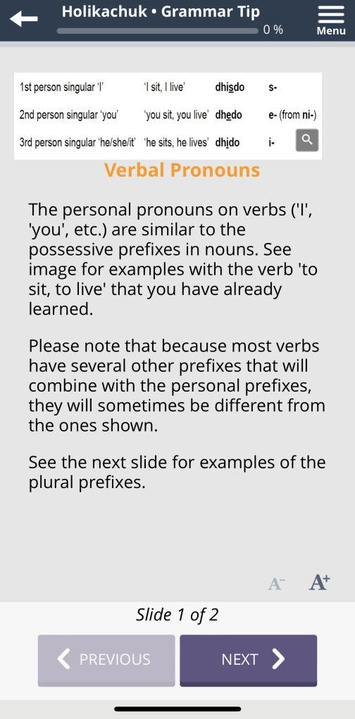 Courses are divided into units, and further subdivided into lessons. Before each unit, there are clearly defined learning objectives, giving users an idea of what to expect from the individual lessons. Some grammatical aspects are baked into each unit, often reflecting as informative slides in the lesson. Occasionally, lessons are also primed with cultural information about the people group that speak the respective language.