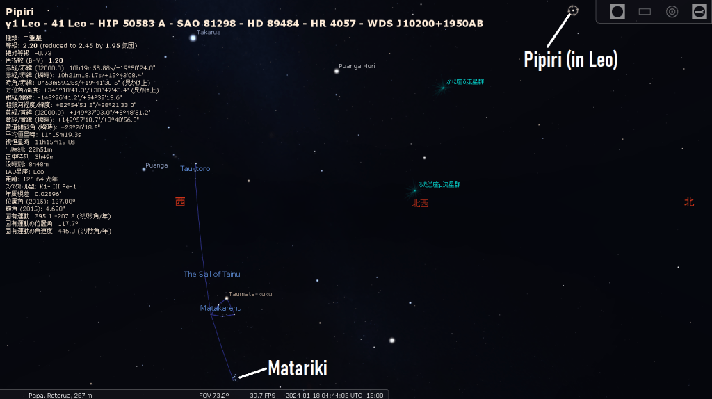 Interestingly, the Māori new year starts in June or July, with the first rising of Matariki, or the brightest star in the Te Kāhui o Matariki or Pleiades star cluster, Alcyone. Some iwi might celebrate with the first rising of Puanga, or Rigel, in the Orion constellation. But the month it corresponds to is generally called Pipiri. Consulting Te Aka Māori for its meaning, it turns out that this also refers to certain stars in Aries that rise before Matariki. And looking these stars up on Stellarium, there is also a star called Pipiri in the constellation of Leo, which rises earlier than Matariki.