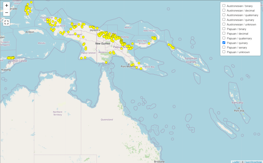 As we have covered previously, languages in New Guinea adopt many different forms of expressing numerals, from body-part tally systems to a whole host of unconventional number bases like the senary. With Austronesian and Papuan languages spoken in New Guinea, some have suggested that the Papuan languages have influenced, in some part, the number systems in the Austronesian languages. But this study argued otherwise — that the Austronesian languages influenced some of the Papuan languages to adopt a quinary numeral system, while the Austronesian languages on New Guinea developed the quinary numeral system influenced by the digit-tallying cultures there.