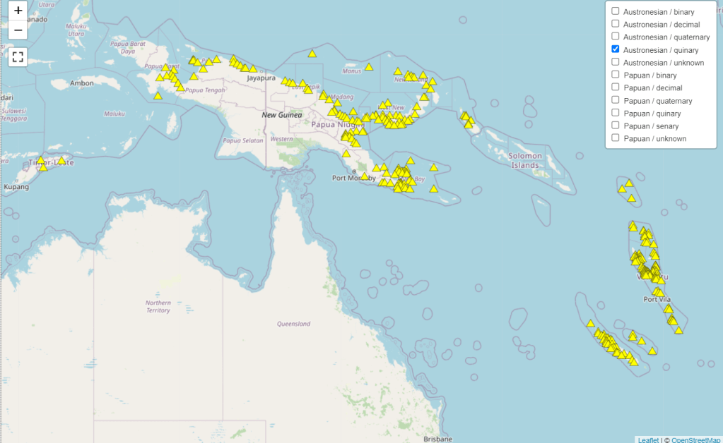 To get a visualisation of what the study is dealing with, I looked up a map in the supplementary information visualising the geographical distribution of Austronesian languages that use the quinary number system. The distribution was quite interesting. In Barlow’s data set, among the couple hundred or so of Austronesian languages that use the quinary number system, all of them, with the exception of four extant languages and one extinct one, are clustered in the region of Melanesia, which encompasses countries like Papua New Guinea, Indonesia (Papua province), Vanuatu, and New Caledonia (part of Overseas France). Furthermore, on New Guinea, the Austronesian languages that use the quinary are spoken in more coastal settlements. This pattern is also seen in Austronesian languages that use the quaternary (base-4), and the binary (base-2), probably with the exception of those in Morobe province in Papua New Guinea. You can access the supplementary information here.