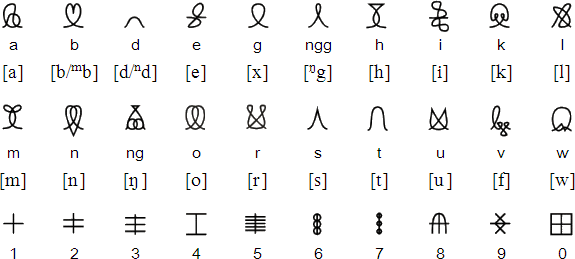 Avoiuli letters are almost a one-to-one correspondence to the Latin alphabet counterparts used by the languages Avoiuli represents, with the exceptions for the letters corresponding to ‘ng’ and ‘ngg’, and the omission of the letters ‘c’, ‘f’, ‘j’, ‘p’, ‘q’, ‘x’, ‘y’, and ‘z’, since they are not generally used in writing Raga anyway. Most of these letters exhibit left-right symmetry, making them easier to write in reverse, facilitating the boustrophedon writing direction in some Avoiuli texts.