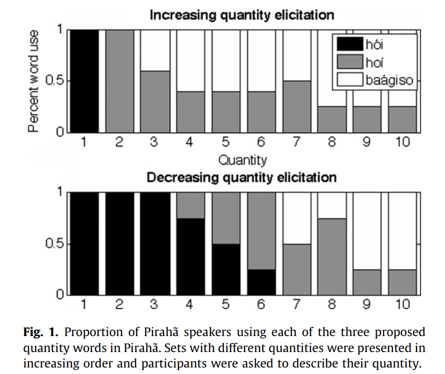 This is far from the first study trying to elucidate number terms in the Pirahã language. A 2004 publication done by Peter Gordon reported the variant of baágiso, aibaagi, and he thought that hói and hoí represented ‘one’ and ‘two’ respectively, noting that these words do not have ‘exact meanings’. And so, hói could mean ‘around one’. In any case, in the 2008 study, it was noted that the linguists and anthropologists primarily involved in the study of the Pirahã language did not, or could not identify any other words that could come close as being ‘numerals’, and ultimately coming to the conclusion that the Pirahã language very likely lacked number terms.