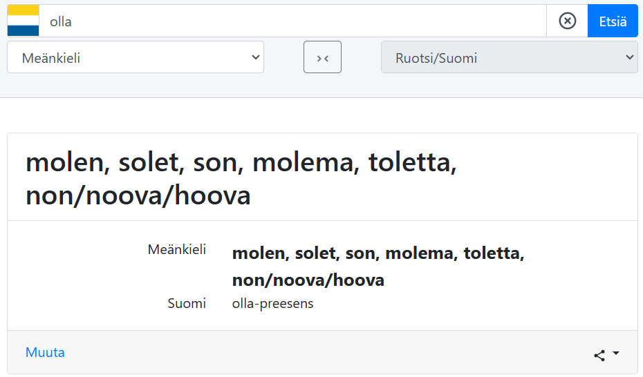 Meänkieli grammar is mostly similar to Finnish, from noun cases to verb tenses. However, in addition to some differences in case endings and conjugations, there are some salient features in Meänkieli that makes it distinct from Standard Finnish. One of the most notable ones I found was the conjugation of the verb ‘to be’ in Meänkieli. Here, spoken Meänkieli tends to contract the personal pronoun with the conjugated verb, something like how in spoken English, we tend to use contracted forms like ‘I’m’ and ‘you’re’.