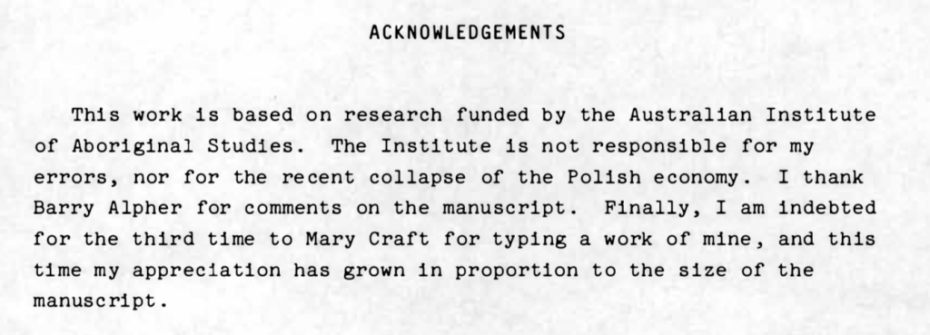 Most of the modern or contemporary research covering the Marra language was conducted by the linguist Jeffrey Heath, who has published materials covering Marra and Warndarrang. Margaret C. Sharpe would also make some publications covering the Marran languages as well, with a particular focus on the Alawa language that has been claimed to be part of this family. One of the primary resources concerning the language is the 1981 publication titled “Basic Materials in Mara: Grammar, Texts and Dictionary” by Jeffrey Heath, which contains one of the more unusual acknowledgements pages I have seen: