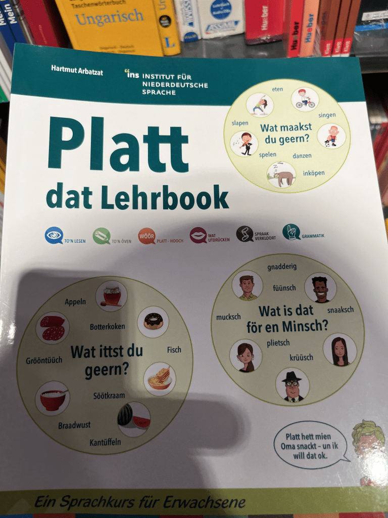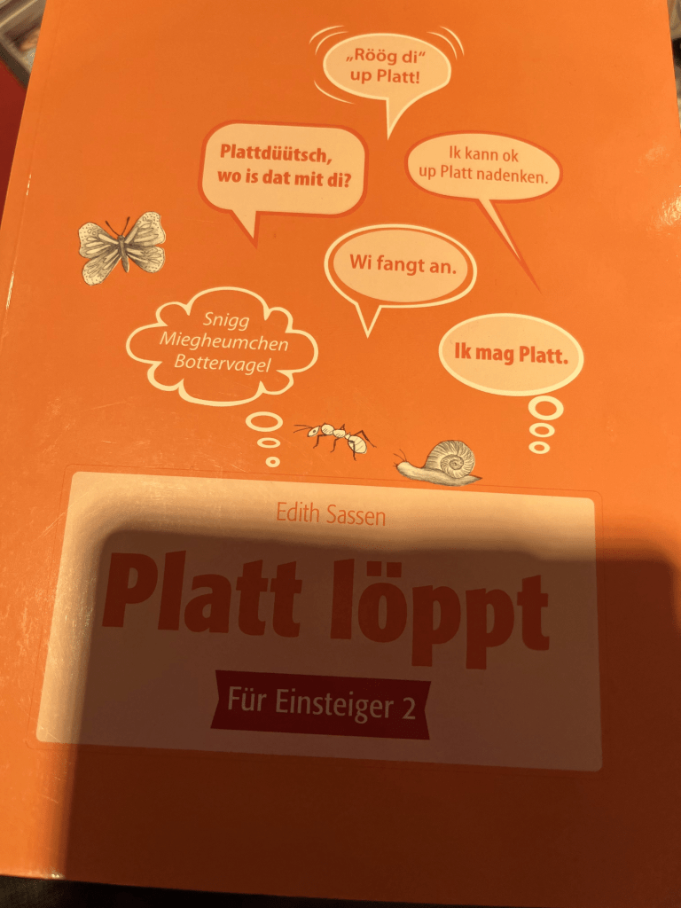 Plattschapp & Plaggenhauer is an example of a publisher and bookshop for Low German literature. Additionally, there are also coursebooks for Low German, despite the lack of a standard form of Low German. One example is the coursebook by the Institut für Niederdeutsche Sprache, an institution based in Bremen, and Platt löppt published by Isensee Florian GmbH in Oldenburg. There is also the book published by Duden in the image at the start of this introduction too. In the materials of varieties in Germany at least, these tend to follow German orthography rules, particularly the one developed by Johannes Sass (or Saß), who has made significant contributions to the documentation and research on Low German. These resources have helped formed this introduction to the Low German varieties, and are in German. I found these books in bookshops in Berlin, so perhaps give bookshops a go the next time you visit the northern regions of Germany.