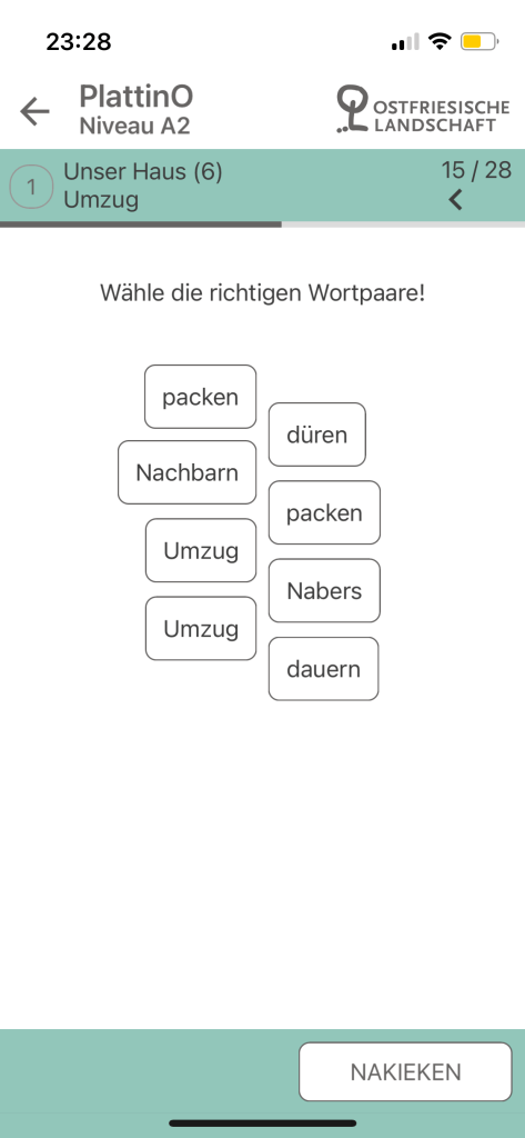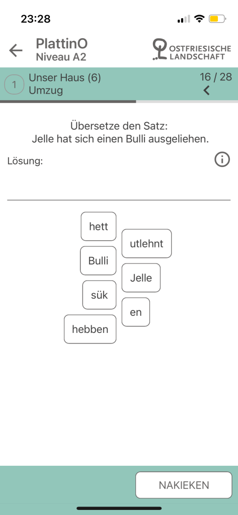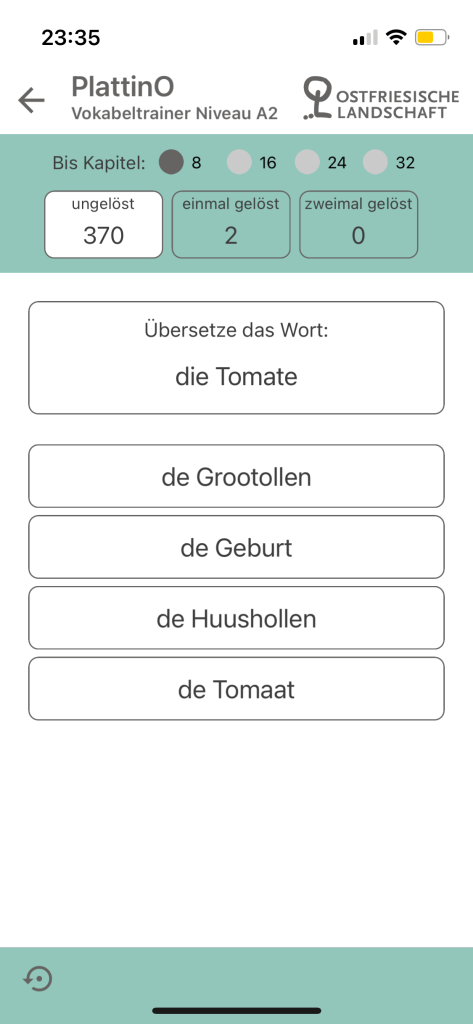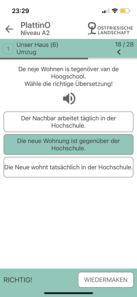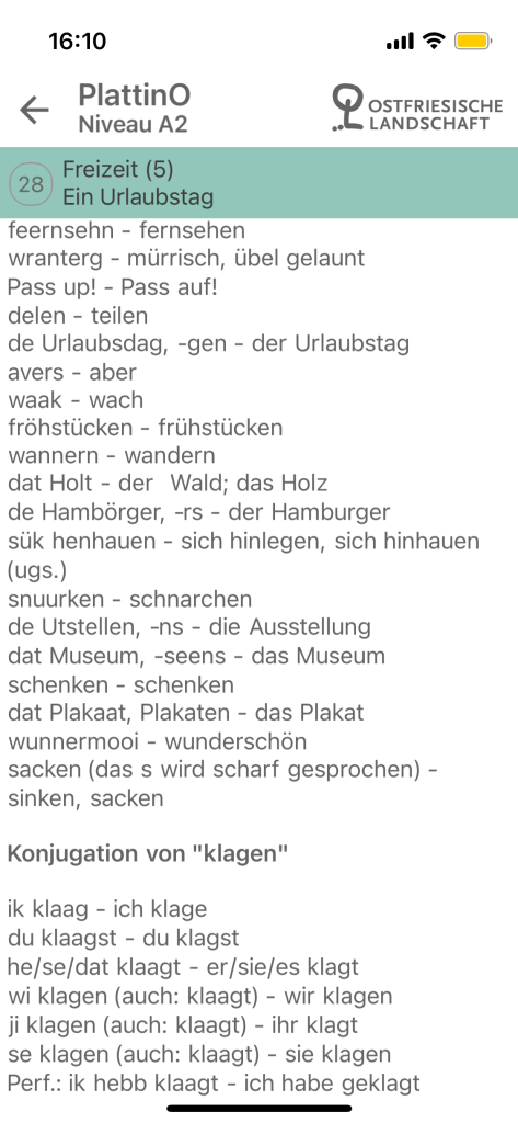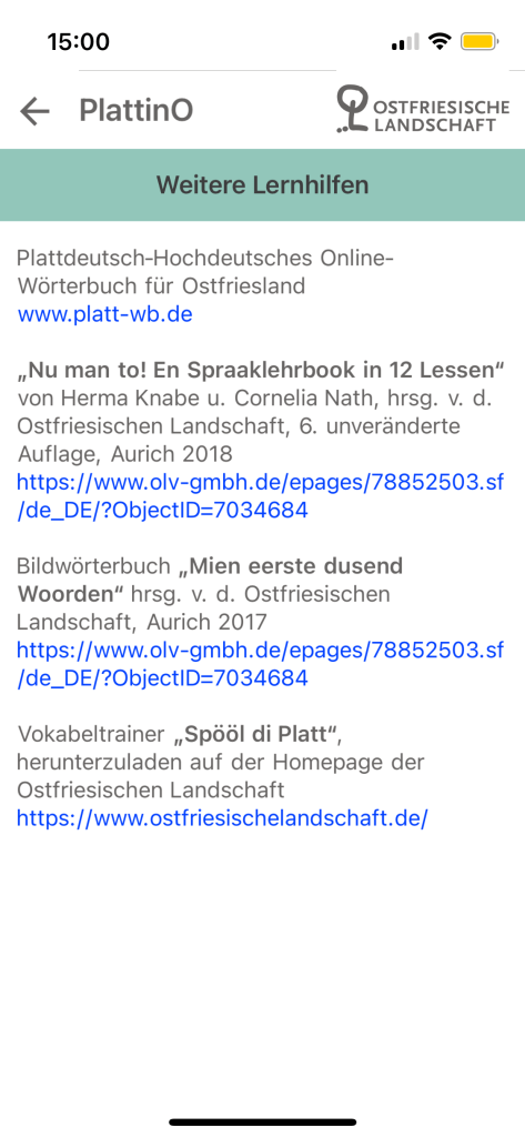 Interestingly, the application has also feature a small section that links users to further resources for East Frisian Low German. Like this application itself, these resources are also only available in German, so it would greatly help to pick up some bits of German while you are at it. It is perhaps one of the more special features for language learning applications albeit a rather minor one. This is because, having used and reviewed several language learning applications for endangered languages or languages with few readily accessible resources, PlattinO is perhaps the only one that actually directs the user or learner to further resources which could help in their learning experiences. As leaners of relatively obscure languages might remark, the availability and accessibility of resources could act as a little barrier to such experiences, so being able to see where to start or what to work with next as on PlattinO’s little section here is pretty nice.