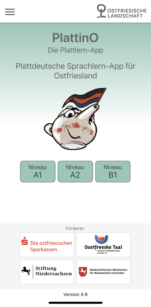 A while ago, we covered one variety of Low German spoken in East Friesland in northwestern Germany, that is, Oostfreesk Platt, or East Frisian Low German. Amongst the resources dedicated to learn this variety of the language, we briefly mentioned the application called PlattinO. Developed by Timm Sodtalbers, and artwork done by Nicolaus Hippen, PlattinO has garnered support by native speakers of East Frisian Low German and the Ostfriesische Landschaft, some of whom have contributed content and audio recordings to this application. And so today, following several months of continuous use of PlattinO, I am ready to present my thoughts on the application.