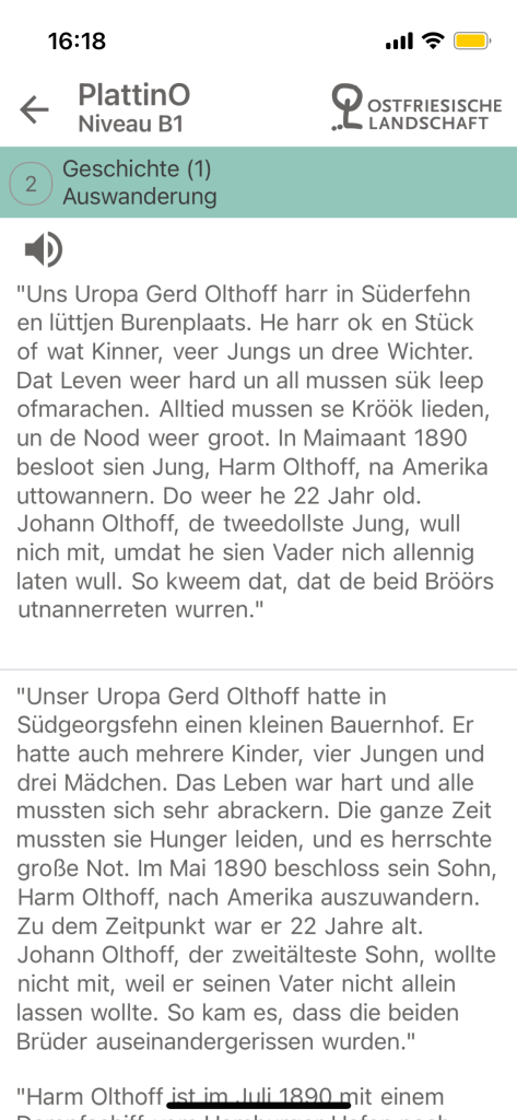 Furthermore, when the user reaches the B1 level, they will be presented with the option to select the option Texte that is presented on almost every chapter. This brings up a passage written in East Frisian Low German, with a corresponding translation in Standard German. Only the Low German has an option to playback the audio, and like some exercises in the application, provides the learner with an idea of how these words are pronounced, and how intonations occur on a sentence level.