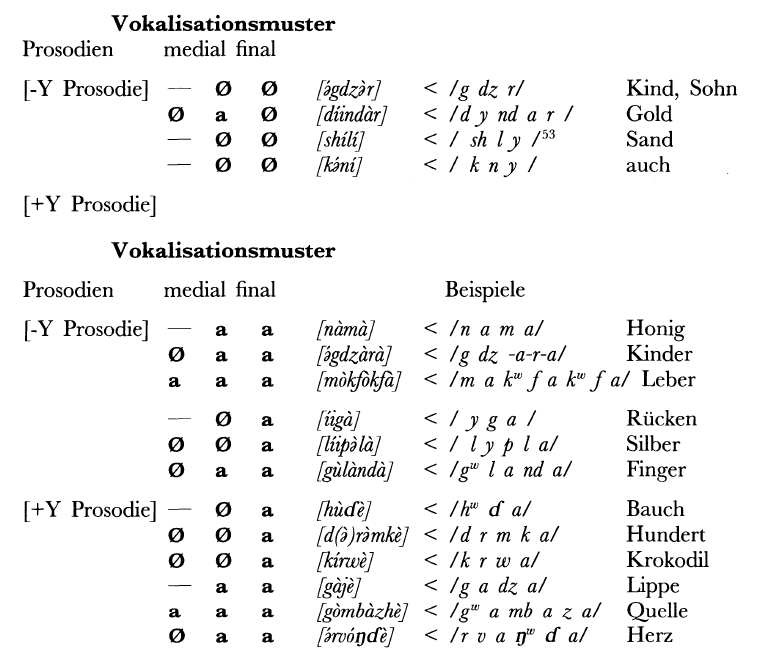 In the publication, Wolff and Naumann analysed the vowel system of Wandala by how the Y-prosody works. They found that the [e:] vowel is essentially a diphthong of /a + y/, something like the –ay sound in ‘day’. The short [Ι] vowel is also predictable, as it occurs after palatal consonants or before /l/. Additionally, the [o] and [u] vowels are essentially surface vowels of some underlying vowel that is found between or before velar consonants. This allowed them to reduce the vowel inventory of the Wandala language.