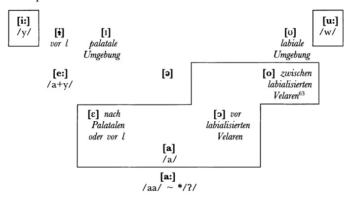 Wolff and Naumann concluded with the following diagram. The enclosed vowels in boxes are considered to contribute some phonological meaning, while those that are unenclosed cannot be considered as phonemic vowels. It does seem that, considering the prosodic processes and other assimilation that takes place, the Wandala language might actually only have a single true phonemic vowel, [a], if it could be considered as one.